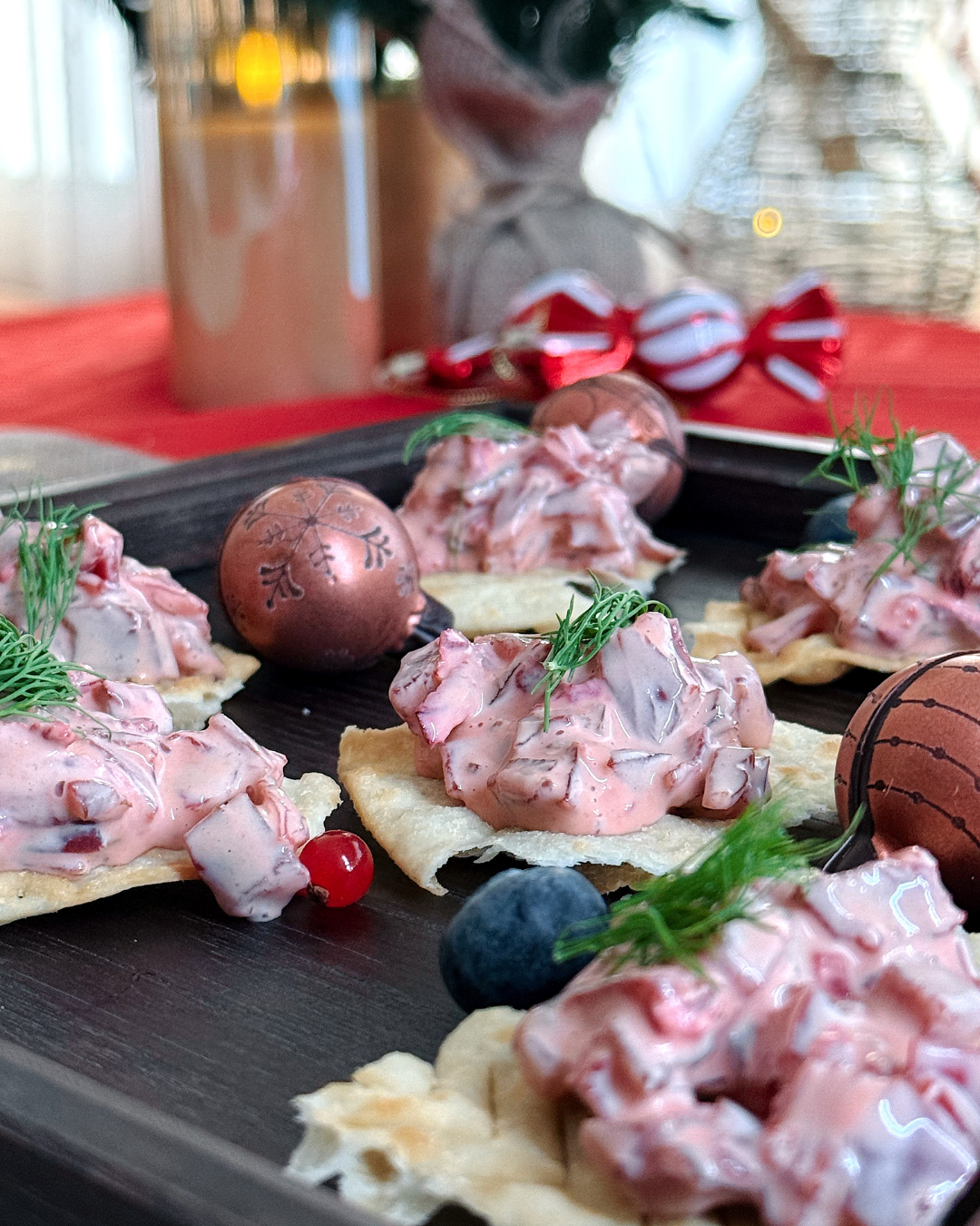 Tvíreykt húskarla-hangikjöt, rauðrófur, dill, hunangs dijon-sinnep, japanskt mæjó og dill
