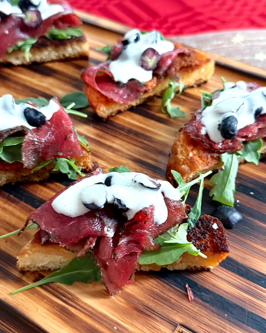 Þessar jóla-bruchettur sameina allt það sem gerir hátíðarborðið sérstaklega girnilegt: steikt Brioche-brauð sem verður gullinbrúnt og smjörkennt, mjúkt grafið naut sem bráðnar í munni og rautt pestó sem gefur lit og djúpt bragð. Steikt bláber og rifsber bæta við sætum tónum á meðan klettasalat og mild hvítlaukssósa skapa jafnvægið. Fullkomnar snittur fyrir jólahlaðborð, aðventuboð eða þegar þú vilt skella í eitthvað sem bæði lítur vel út og bragðast sem algjört lostæti.
