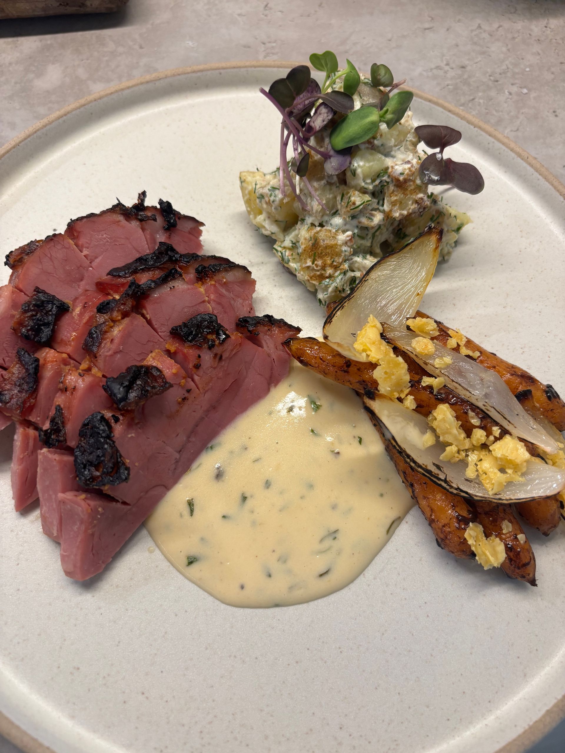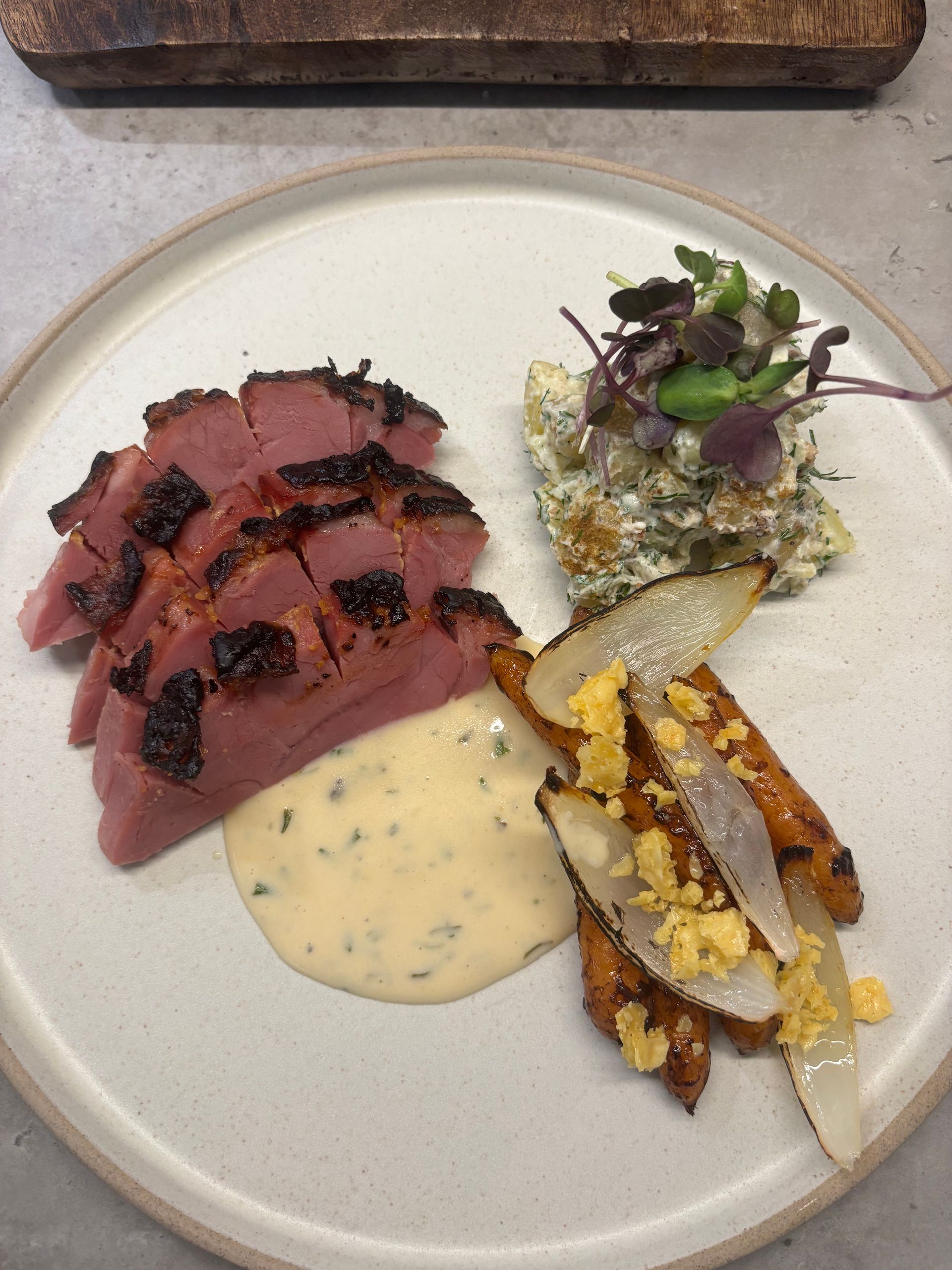 - Fyrst eru gulræturnar blandaðar saman á bakka við balsamik gljáa og nóg af smjör, passa að gulræturnar séu allar hjúpaðar í balsamic áður en þær eru bakaðar á 190c í ofni þangað til mjúkar.