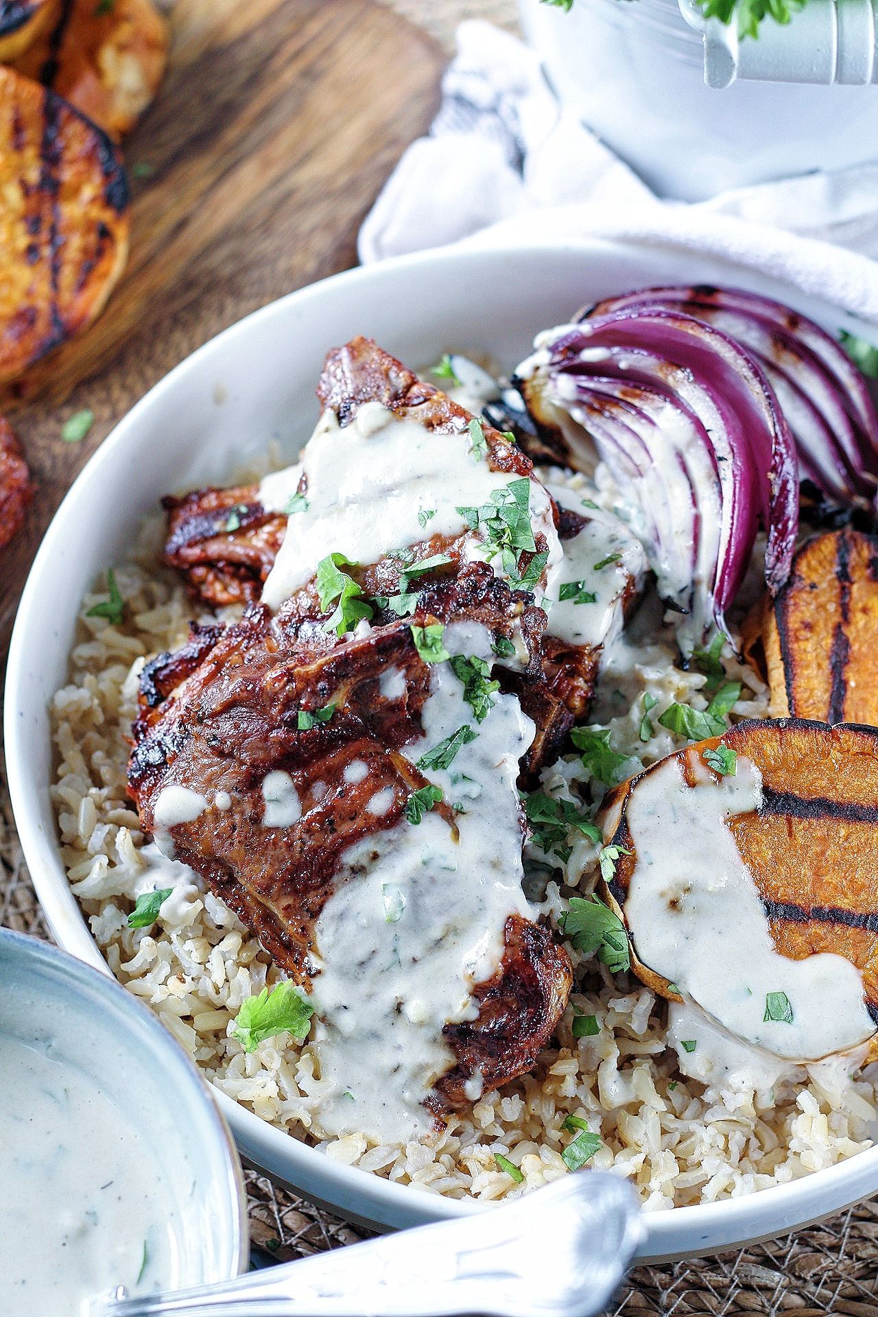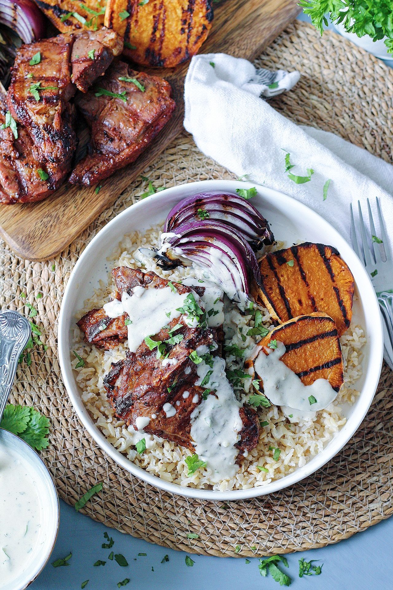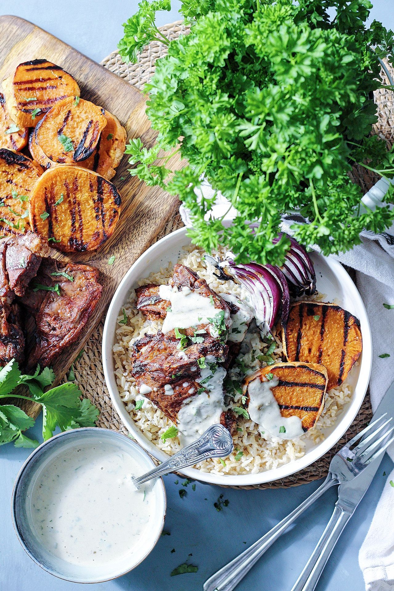 Íslenska lambakjötið er best og það þarf ekkert að rökræða það frekar. Það er hægt að leika sér með það og matreiða það á ótal vegu. Ég hef alltaf verið veik fyrir grilluðu lambakjöti en þá verður að grilla það snöggt á blússheitu grillinu svo það ofeldist ekki. Mig langaði í eitthvað aðeins öðruvísi en þetta venjulega og ákvað að henda í uppáhalds jógúrtsósuna mína og bera kjötið fram með henni ásamt grilluðum sætum kartöflum, rauðlauk og hýðishrísgrjónum. Rétti á borð við þennan er hægt að panta á einhverjum veitingastöðum en mér finnst alltaf best að útbúa þetta heima. Næst þegar þið ætlið að skella kótilettum á grillið mæli ég með því að þið prófið þessa útgáfu!