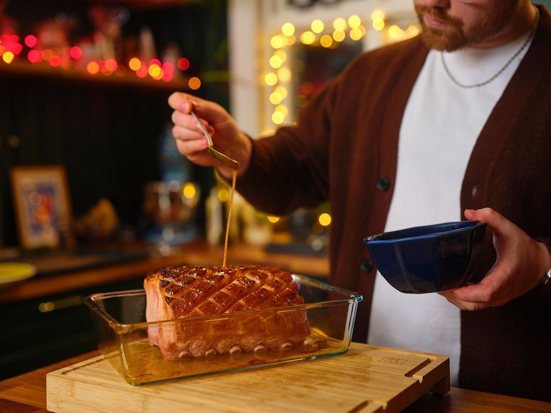 Þessi marinering er eins og smá jólakveðja yfir hrygginn – blanda af hunangi, púðursykri og Dijon-sinnepi sem gefur bæði sætleika og mildan kryddkeim. Hún karamellíserast fallega í ofninum og skapar þá gullnu, glansandi hringi sem mörg okkar tengja við jólamáltíðina.