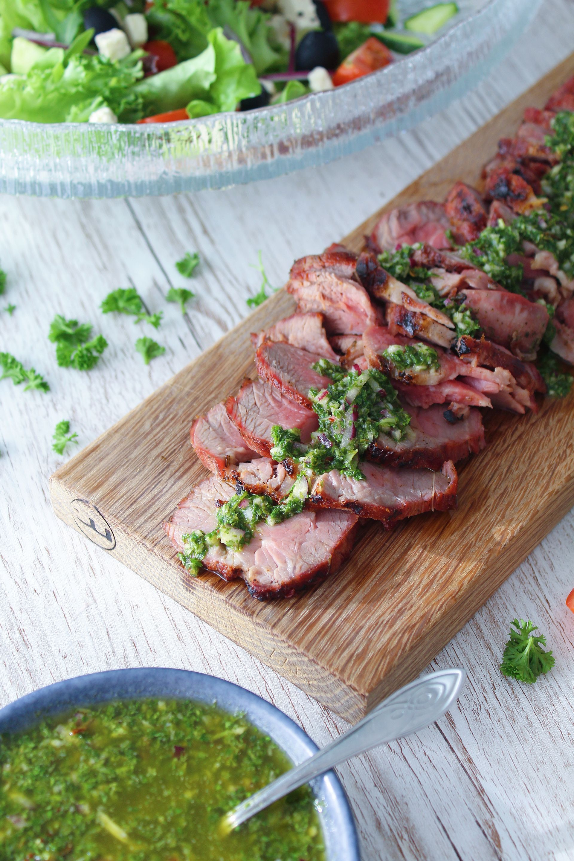 Lamba prime-ið frá Norðlenska er alveg framúrskarandi gott, lungamjúkt og hvítlauks og rósmarín marineringin passar sérlega vel við ferskt salat með ólífum, feta, rauðlauk, tómötum og agúrku ásamt myntu chimichurri gerir þessa máltíð að þvílíkri bragðsprengju. Fallegt á borði og upplagt að bera fram í matarboðunum í sumar.