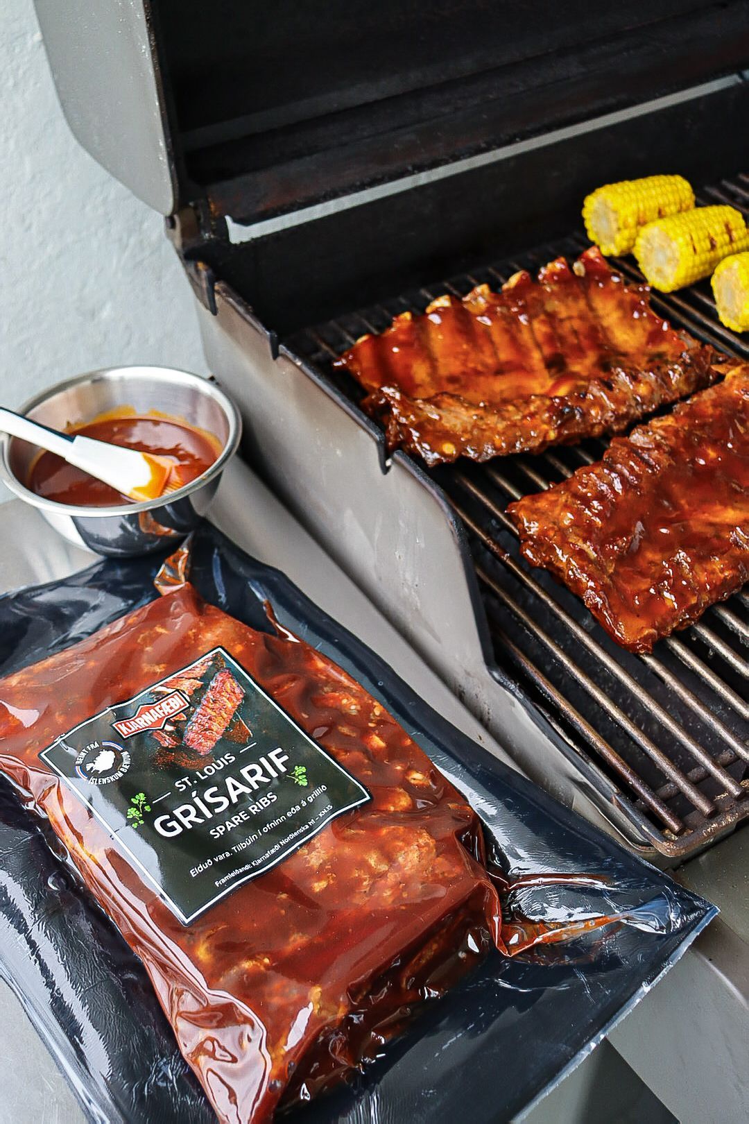 - Færið bakkann með rifjunum að grillinu ásamt maísstönglunum og bbq sósunni.