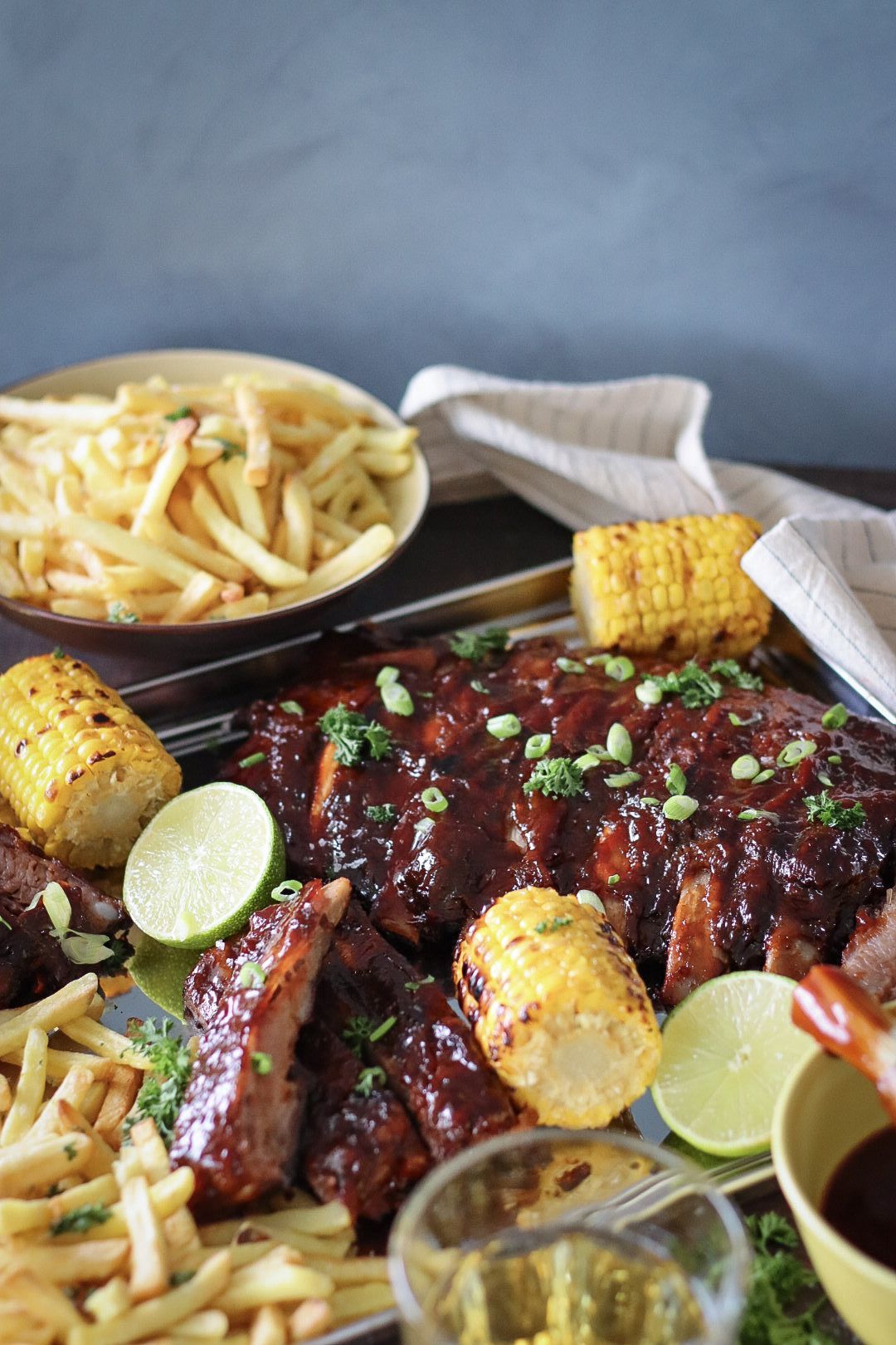 Grilluð St. Louis BBQ grísarif með frönskum og maís
