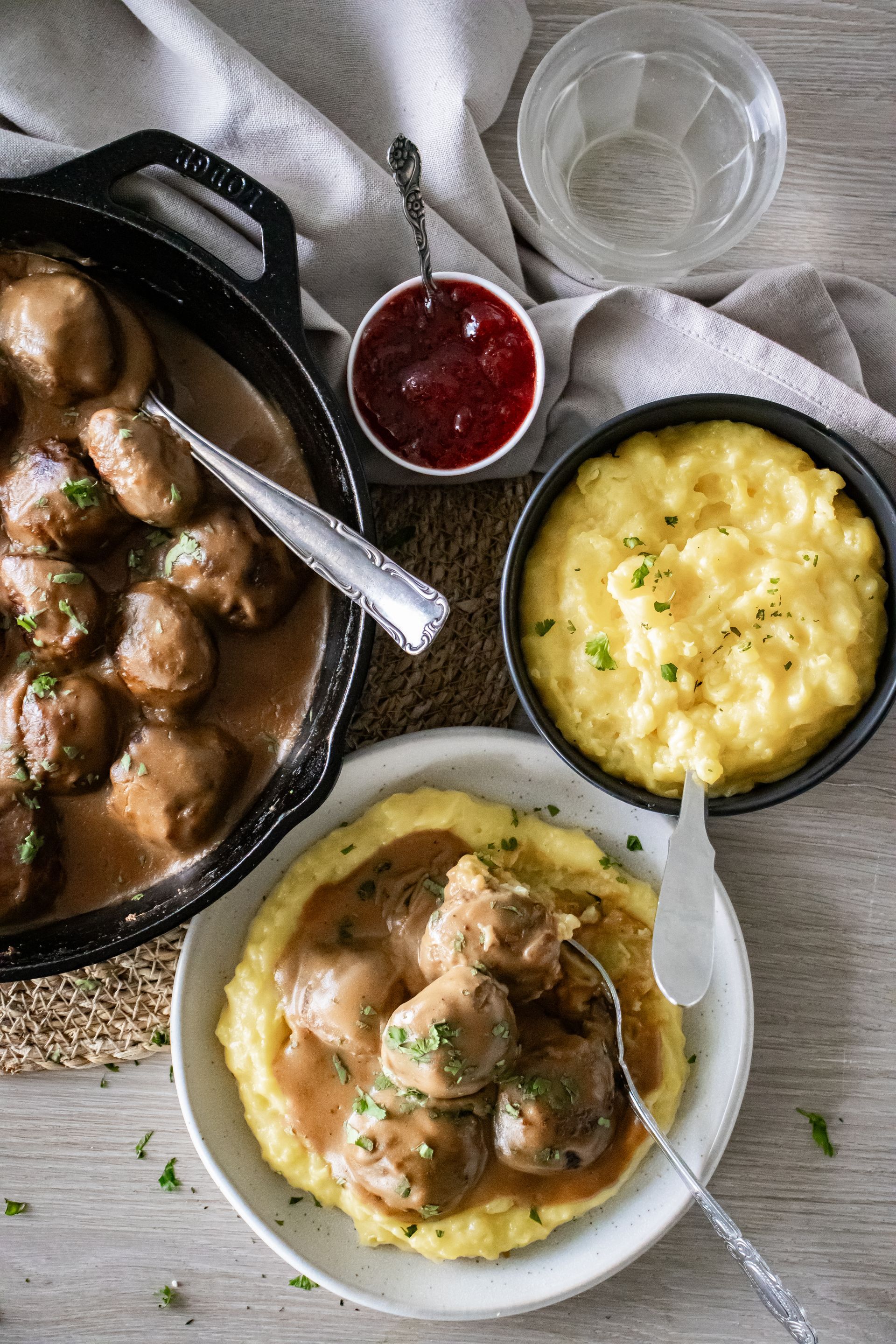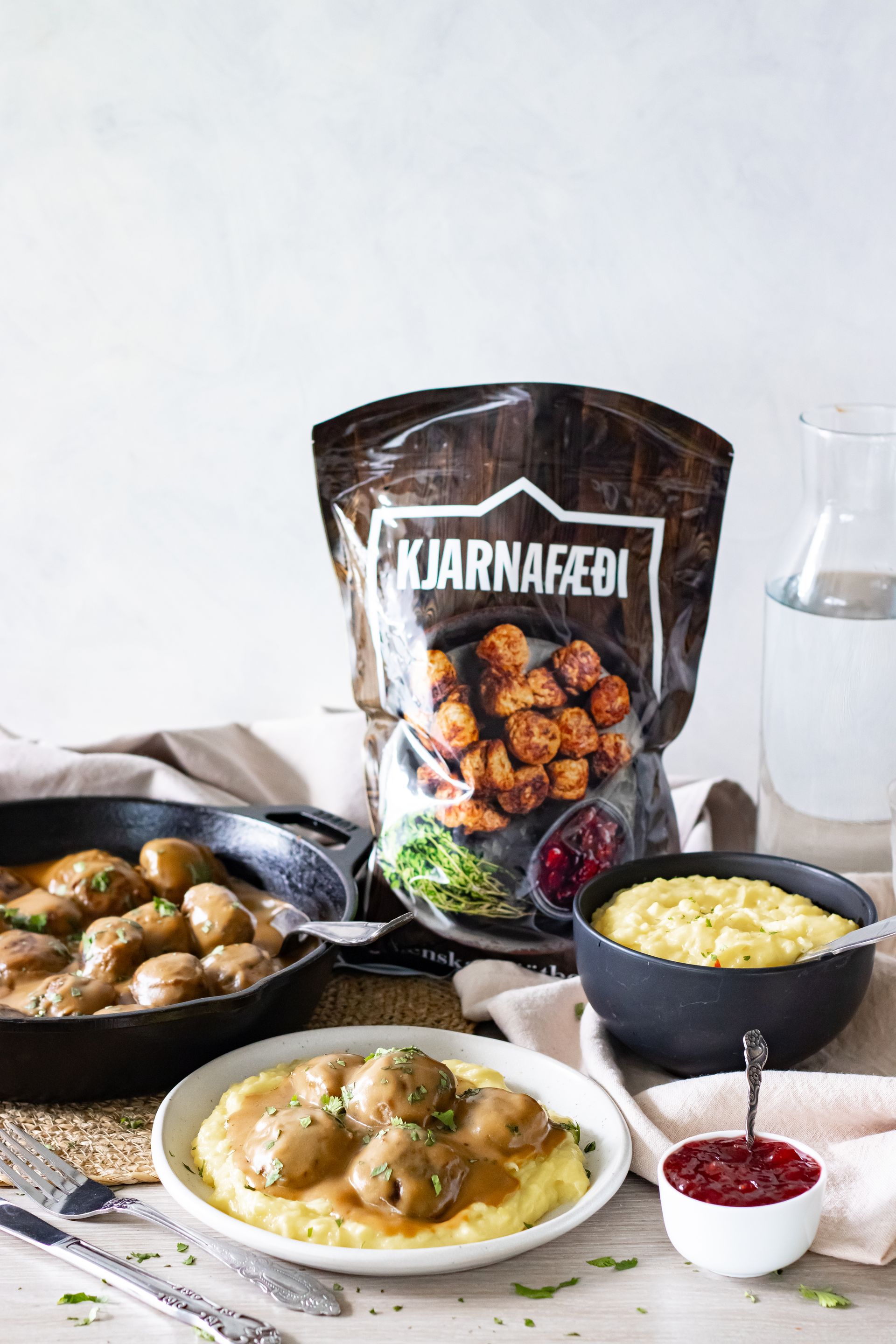 Ef þig langar í góðan heimilismat en ert ekki alveg í stuði til þess að gera allt frá grunni þá eru sænsku kjötbollurnar frá Kjarnafæði algerlega fullkomnar. Vissulega væri hægt að fara alla leið og grípa með sér tilbúna sósu og kartöflumús en núna langaði mig bara að stytta mér hálfa leið. Heimagerða kartöflumúsin er bara svo miklu betri en þessi úr pakka. Ég gerði svo sósuna beint á pönnunni sem ég hafði brúnað tilbúnar bollurnar á. Það gefur svo ótrúlega gott bragð.