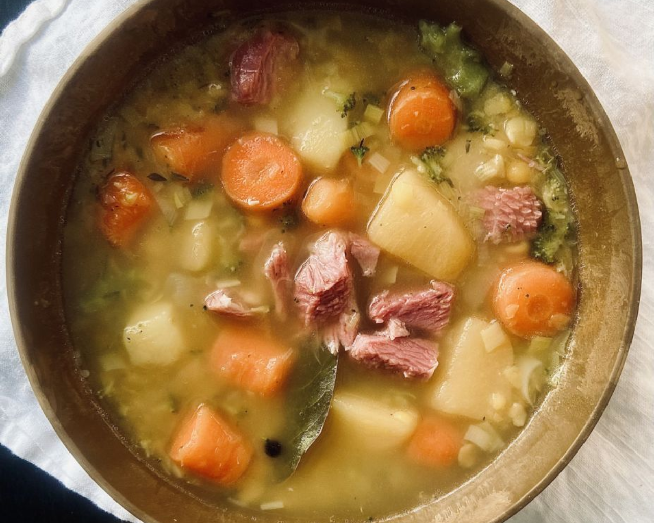 - Ausið soði frá saltkjötinu saman við súpuna og smakkið til.