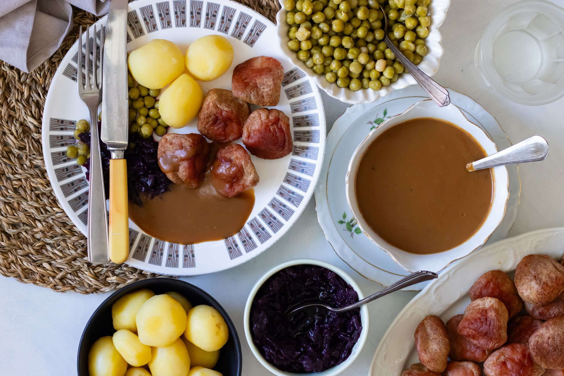 - Berið kjötfarsbollurnar fram með soðnum kartöflum, grænum baunum, rauðkáli og brúnni sósu.