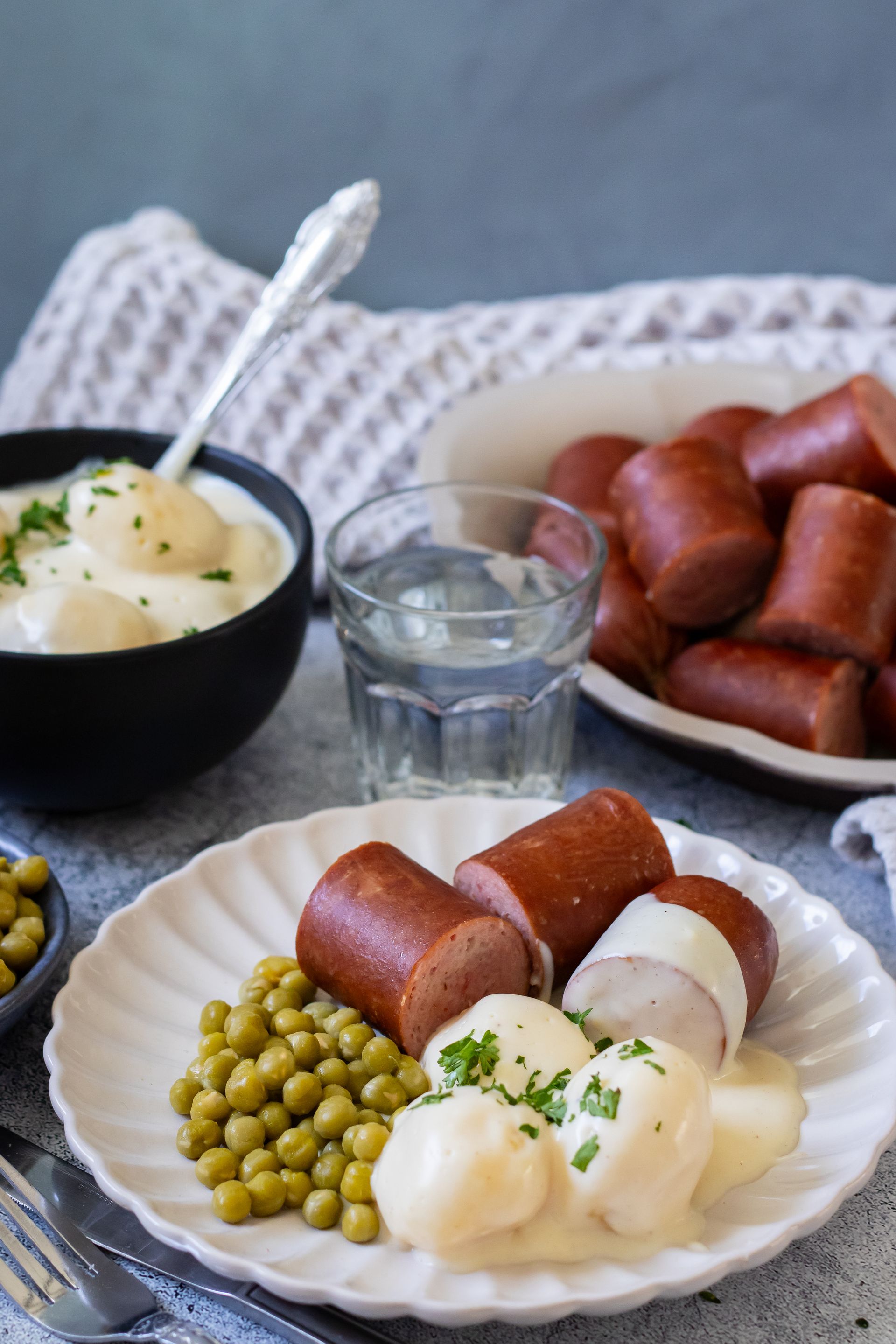Sveitabjúgu með uppstúf, kartöflum og grænum baunum